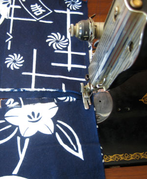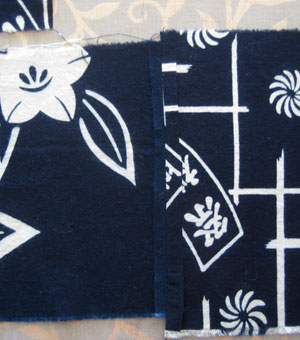 - Note: I used different fabrics than the ones in the kit, mainly because these were bolt ends or other odd sizes. The amount of fabric is roughly the same as in the kit, however, and some of the fabrics I’m using are still available in my shop if you’d like to try working with them instead of the kit. They are all indigo yukata cottons with a similar weight, texture and touch.