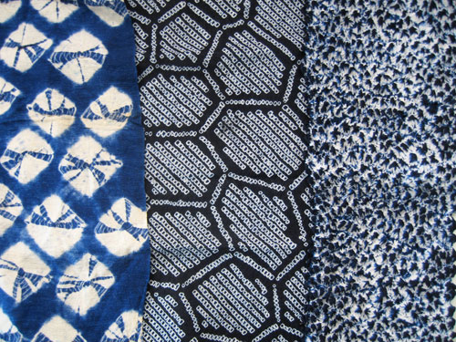 These three show just how diverse a medium shibori can be. The piece on the left is a vintage textile, possibly intended to be used as a baby’s diaper/nappy. We should all have such fashionable bums.