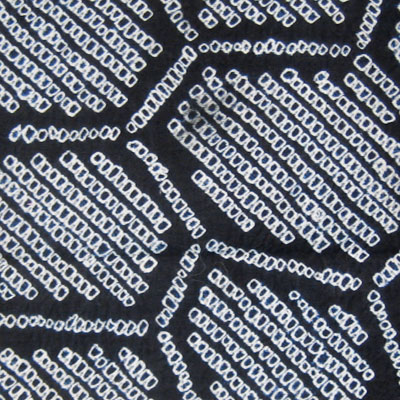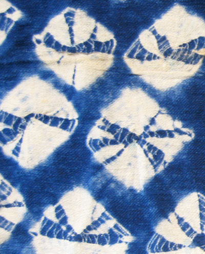 The shibori technique is square ring dots, or yokobiki kanoko. The design is stenciled onto the fabric before tying, then bound quickly with very little thread on each binding (more thread=larger resisted area, less thread=smaller resisted area). This cotton, although quite dark, is quite thin and gauzy when held up to the light. One might imagine wearing a yukata made from this in a hot, humid summer and finding it quite breezy, but still modest.