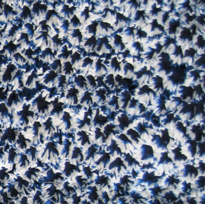 This technique is a somewhat random form of a usually staid looped binding called miura shibori. Miura is often seen done in rows, but this one is quite different. The result is a highly textured, vivacious and chaotic splash effect, the sort you’d find done by an artist who is well acquainted with the rules and chooses to ignore them. Note how the peaks were bound toward the bottom, but not at the top. This give a stark contrast with dark indigo in the foreground and crisp white in the background, the opposite effect seen in the first piece of the three. The fabric has not been steamed, so the peaks remain as they were the moment the binding threads were removed. Beautiful.