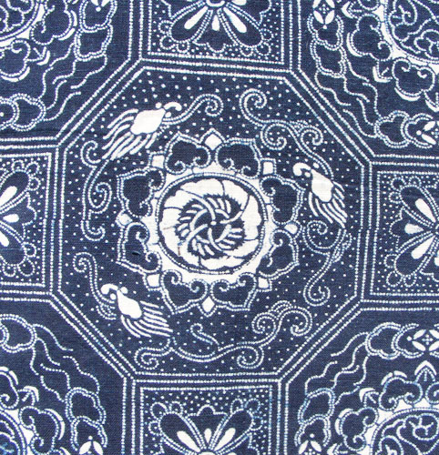 While the fabric above would have been directly dyed through the stencil (so far as I can tell, I am not a dyer myself), this next piece would have been treated with a rice paste resist through the stencil, then dip dyed in a vat of indigo. Technically, this makes it aizome (ai meaning blue). Note the difference in color from front to back. This appears to have once been used as a futon cover, but came to me as a single length of fabric so I can only assume such provenance.