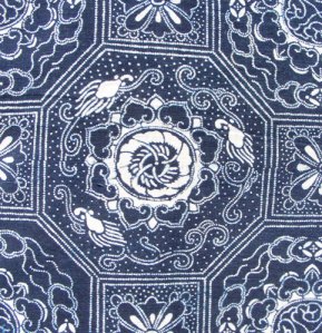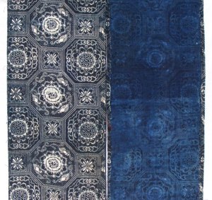 The cotton is handwoven, hand dyed and perhaps even hand spun. The stencil was not so expertly placed, as evidenced by the irregular areas where it jarringly meets. The stencil design itself is only 12.5″ wide by 8″ long (32 cm x 20 cm), rather narrow by today’s standards.