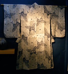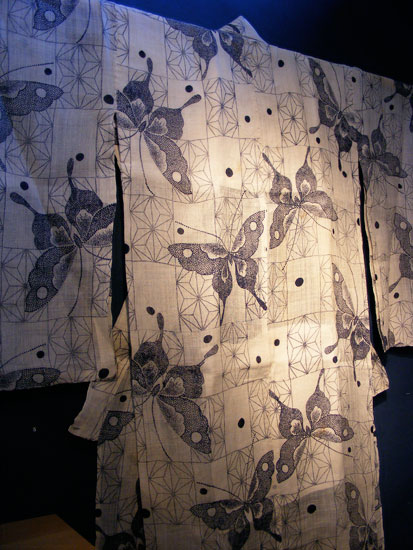 Butterflies are a common summertime theme, and these have been rendered in such a way they appear very cool and breezy. This katabira may have been designed for evening wear, as the light color would stand out in the deepening shadows, and the ephemeral butterflies would sparkle in moonlight. Such is the benefit of dyeing with the katazome technique, as it allows for such finely rendered detail.