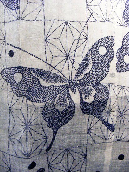 The textile is a soft, off-white color with delicately stencil-dyed indigo butterflies and asa no ha (麻の葉), a stylized hemp leaf design.