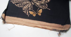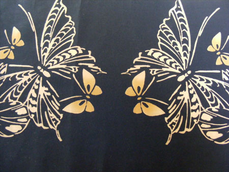 The morning glory fabric above has been mass-produced in the deep, dark synthetic indigo so often seen on casual summer yukata. The butterfly fabric, however, appears to have been carefully hand dyed with indigo over a beige fabric which almost looks as if it has been tea-dyed. I’m guessing that a rice paste resist was applied with a stencil or block to create the delicate butterflies. The darker wings of the small butterflies were added in as a final touch.