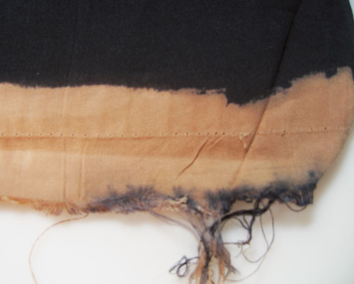Note that there are no actual curves on a kimono. Anything that appears curved is an illusion, basted, stitched or tucked into being. All cuts are straight. This facilitates reuse as when a single part of the garment becomes worn or stained, it may simply be relocated. Worn cuffs on sleeves may be swapped so that the worn part is now hidden under the arm and the part previously under the arm is now the cuff. This is similar to turning the collar on an old dress shirt, as my mother used to do.