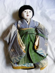 All in all, it’s been worth the wait. While I am saddened by the condition of the blue kimono, it gives me an opportunity to make him a new one. Goodness knows I have plenty of kimono fabric on hand, including men’s fine brown pinstripes and more rustic weaves. His new kimono many not be as formal or as elegant as his old one, but it will at least still be authentic to some degree. If nothing else, he will have a change of clothes for casual outings.