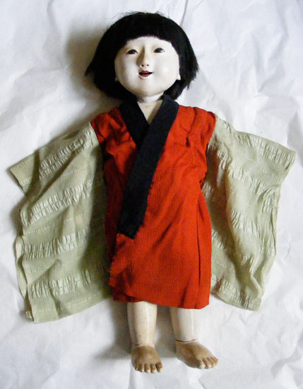 First of all, Anne’s work is really beautiful. His face looks much better than the cracked and poorly glued mess that it was! His eyes are clearer and now appear to be pleasantly brown, rather than murky blah. Anne also patched several other small body dings and cracks, giving him back at least a little of his youthful appearance. The color is a bit uneven, which makes sense, really. Gofun is white when it’s fresh, and patinas with age and contact with sunlight, dirt and oil, such as from a child’s playful hands.