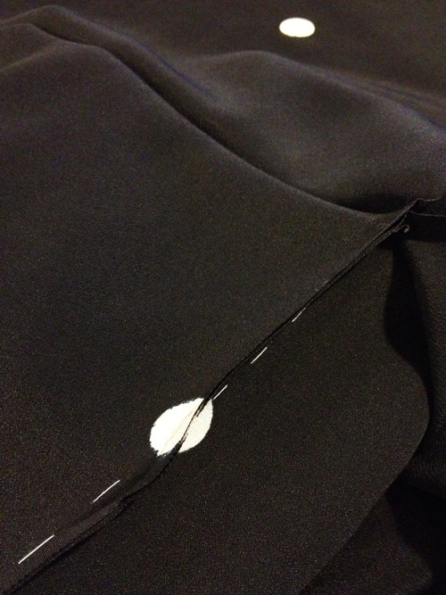 Basting stitches and blank crests. The silk starts out plain white, not black. These circles are carefully reserved during the dye process as the fabric is dipped into vats of black dye or brushed on by hand. The careful application of specific family crests is done by a limited number of small, family run businesses who have been involved in this highly specialized industry for decades, if not centuries.