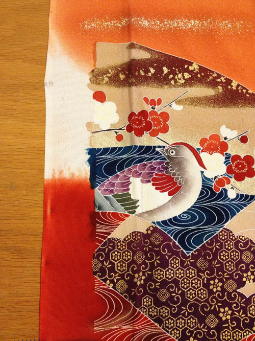 The deconstruction begins! The crease visible down the middle of the image shows where this panel was basted to another. The image runs a few inches beyond that, but not to the selvage. Why all the extra inches where they’ll never be seen? They exist in case the kimono needs to be let out or otherwise altered in the future. Considering the hefty investment of a custom kimono, the owner might very well pass hers down to a daughter, and eventually to a granddaughter. Modifications will need to be made at some point. A taller or wider woman may inherit it, or someone may stain it in an area that can be concealed by adjusting a seam.