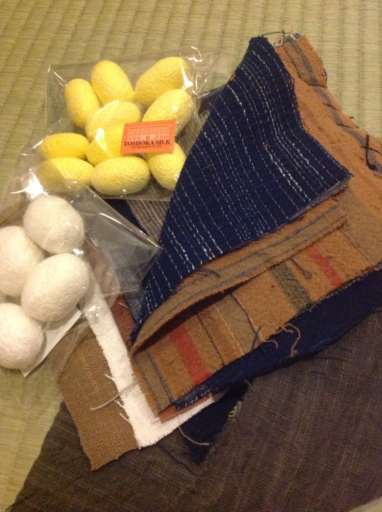 This photo shows a bit of my stash so far on this trip: two packets of cocoons (the yellow color is natural and somewhat rare) and a bundle of scrap cotton from a local textile mill.