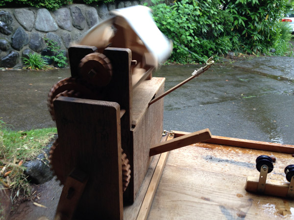 The small arm with a wire loop moves back and forth to keep the thread spinning evenly onto the square wooden spool. The thread is a naturally beautiful, creamy white.