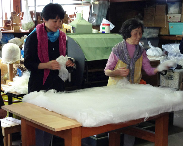 Apprentice Noriko san and Koyota’s wife add to the fluffy layers. Many of us started yawning at this point, as watching soft clouds of silk floating down onto the table was quite soporific. [I’ve always wanted to use that word in a story! It means sleep-inducing.]