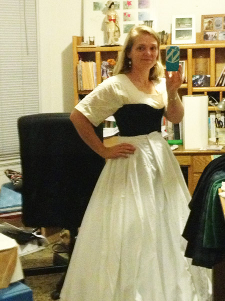 The green velvet skirt front is from my very first Renaissance Faire costume… circa 1987. It’s been creatively reused a few times since then. The back part is a large square of plaid Pendleton wool (similar to this one), possibly as old as the velvet, that had been in my mother’s stash until she died. The wool is gorgeous stuff and flows beautifully when I dance. Not that I get to dance much. Thomas doesn’t like dancing.