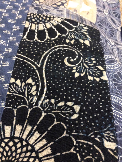 quilt_blueboro1If you’ve seen me at a show or come to the Kimonomomo studio in the last few months, you’ve probably seen the quilt I’ve been working on. Pieced from Alexander Henry, Moda, Olympus, and Kona Bay prints, plus a few 19th century katazome cottons, it’s coming together nicely.