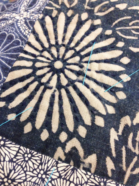 Much of the time I’m following along a design, not giving it too much fuss. I do a lot of the sashiko while I’m in my booth at a quilt show, in my hotel room in the evenings after a show day, or sitting on my living room sofa with the dogs. I didn’t want to plot out complicated designs that would involve counting, but I did want to go for an interesting texture. Working through one square at a time, I’ve found a look for each fabric that I’m happy with. Some are rows of straight lines and nothing else, but some have some real character. quilt_blueboro3 quilt_blueboro2
