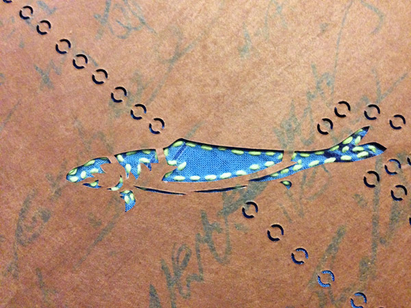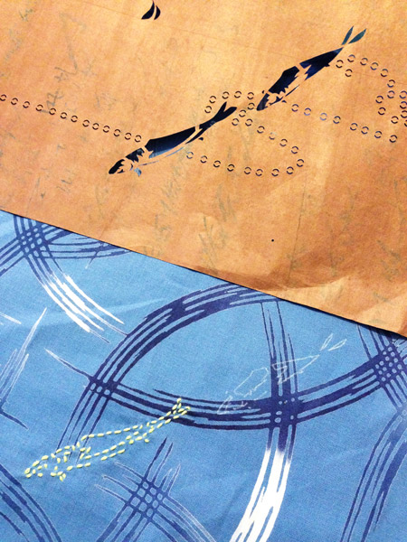 The katagami itself is a work of art. Made from recycled paper and cured with persimmon tannin (kaki-shibu), the fish and bubbles were delicately hand cut. Unlike some of the katagami in my collection, this one has not been reinforced with silk mesh so I had to work carefully to not damage the fragile paper.