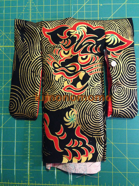 Another project that has been keeping me busy for a few days is this miniature kimono. I wanted drama, with a Kabuki-like visual punch, and these fabrics from Alexander Henry fit the bill.