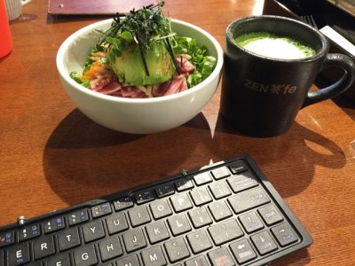 At Zen (cha)’Fe, a little cafe specializing in light lunch and desserts, plus matcha! I am happy. Got a matcha soy latte (hooray for English menu!) and a donburi with avocado and bacon. First sip of latte I got soy milk foam on my nose. Second sip I got to the matcha… it’s strong and tasty. They also offer regular matcha (strong) or American matcha (weak). I was in the mood for a latte, so there you go. Server was surprised I didn’t want to add any sweetener.