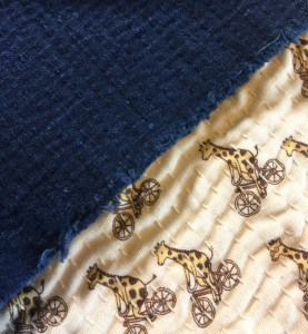 The finished work is quite small, and I’ve been asked if it’s meant to be a burp cloth for a baby. It isn’t meant to be anything at all, simply an experiment for someone who has limited time and a curious mind, who also likes to make things that are pleasing to the eye and hand. This piece is highly tactile, and once you hold it, you can’t help but pet it. My stitches are large compared to the antique indigo shown, but you can make your stitches any size you like. Changing the length and spacing of stitches will result in different effects, so I heartily suggest experimenting with that yourself. You may be pleased with the results. Several customers who have seen my various works in progress have also jumped on the sashiko-double-gauze train, and a few have been back for more after completing their first piece. Stitching through double gauze (without batting) is such a delight as the needle slips through the fabric like a hot knife through butter.