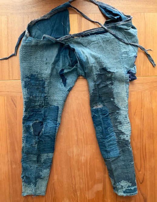 The fabric is built layer upon layer, with patching on the inside as well as the outside. The legs were initially built on a rectangular base (note the seams below) and heavily patched at the knees, with thinner fabric in the back of the leg to hold it together. The front shows even stitches with sashiko reinforcement from crotch to ankle, but there is very little to reinforce the back. The difference in density from front to back shows how much time the wearer would have spent on his knees. Thinner fabric at the back of a bent knee would mean less pressure while kneeling, while the padding in front offered more support and protection.
