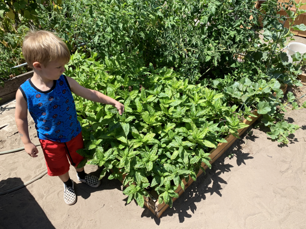 Japanese Indigo ‘Persicaria Tinctoria’, shown here with our junior assistant. Also, some tomato plants. And maybe cucumbers? We’re not sure yet. Every spring I pull vegetable sprouts from our compost bin and hope for the best.