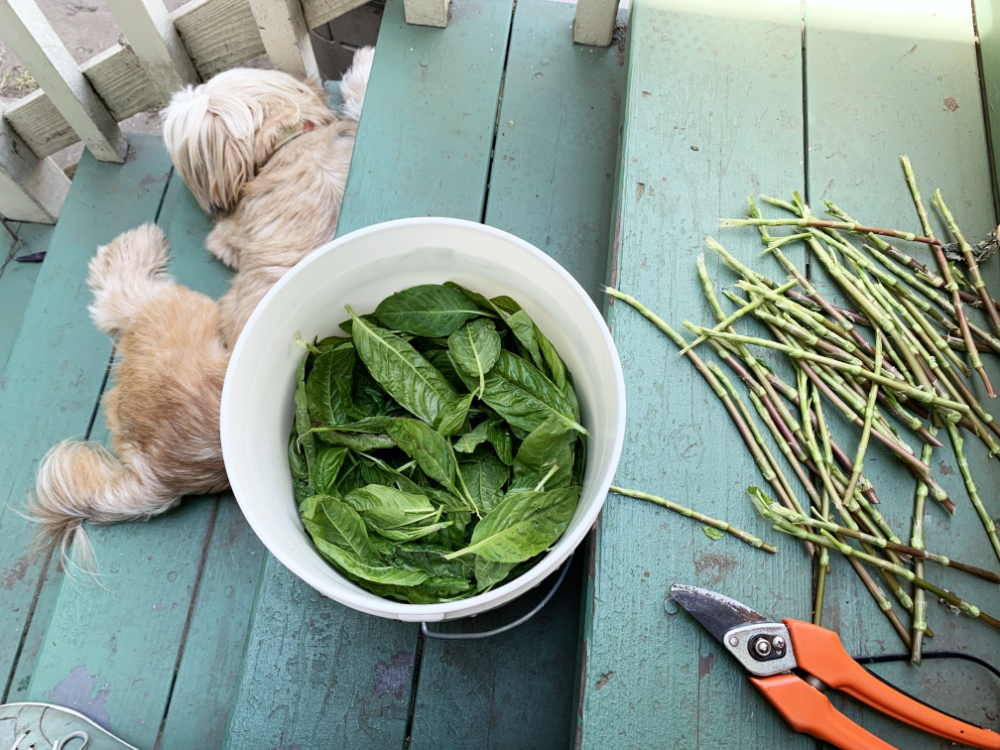 After trimming a bucket of indigo sprigs, we still had plenty of plants left to work with. I only harvested the top parts of a few plants to see how well they grow back for a second harvest this fall. We haven’t seen rain since April and we don’t water very often, which means we don’t get a lot of lush growth (except for tomatoes, which are happy to grow with almost no water). What you can’t see is the oja (or olla) in the middle, slowly irrigating the plants in that box. I got some ojas locally at Pollinate in Oakland, CA a few years ago, and a few more directly from GrowOja.com this year.