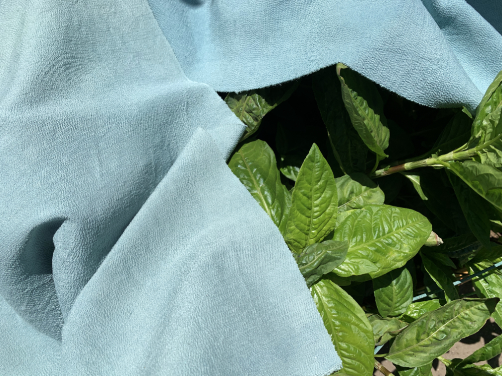 We washed the leaves, added some salt, and a tossed it all in a bucket to macerate. I took two 1-yard pieces of vintage, undyed chirimen kimono silk and we went wild. We crushed, we squeezed, and we just goofed around with the leaves for a while. After each “dip” we let the fabric dry for a while, then did it again. The color was a bright turquoise-green while wet, and dried down to a soft aqua.